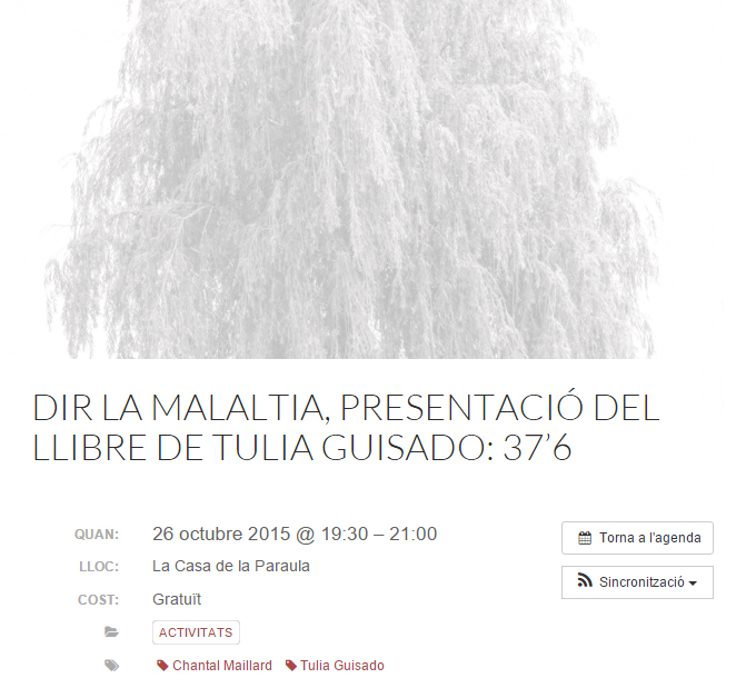 Fue un acto muy emotivo en el que Chantal expuso algunas reflexiones sobre el tema «Decir la enfermedad» («Dir la malaltia»), indagando en el hecho del dolor y la enfermedad, y la dimensión social de ambos. Después, Tulia y Chantal hicieron una lectura compartida de algunos poemas del libro.