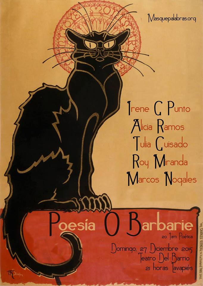 El colectivo Masquepalabras.org, que organiza el espectáculo de la palabra Poesía O Barbarie en el Teatro del Barrio de Lavapiés (antigua Sala Triángulo), eligió a Tulia como participante del último evento del año, el 27 de diciembre de 2015. Os dejamos el cartel, algunas fotos y un vídeo con un fragmento de su actuación.