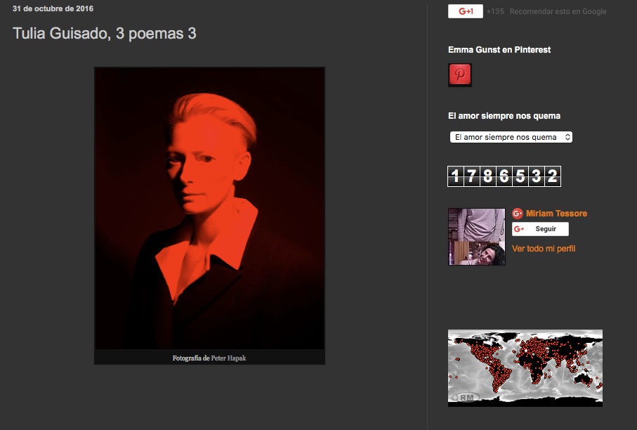 30 diciembre, 2016 Reseña en el blog Emma Gunst El blog Emma Gunst publicó tres poemas de Tulia el pasado 31 de octubre. Podéis ver la entrada en este enlace. Compártelo: Haz clic para compartir en X (Se abre en una ventana nueva) X Haz clic para compartir en Facebook (Se abre en una ventana nueva) Facebook Me gusta Cargando... Relacionado