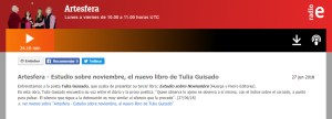 Tulia ha sido entrevistada una vez más en Artesfera, de Radio Nacional de España, con motivo de la publicación de Estudio sobre noviembre.